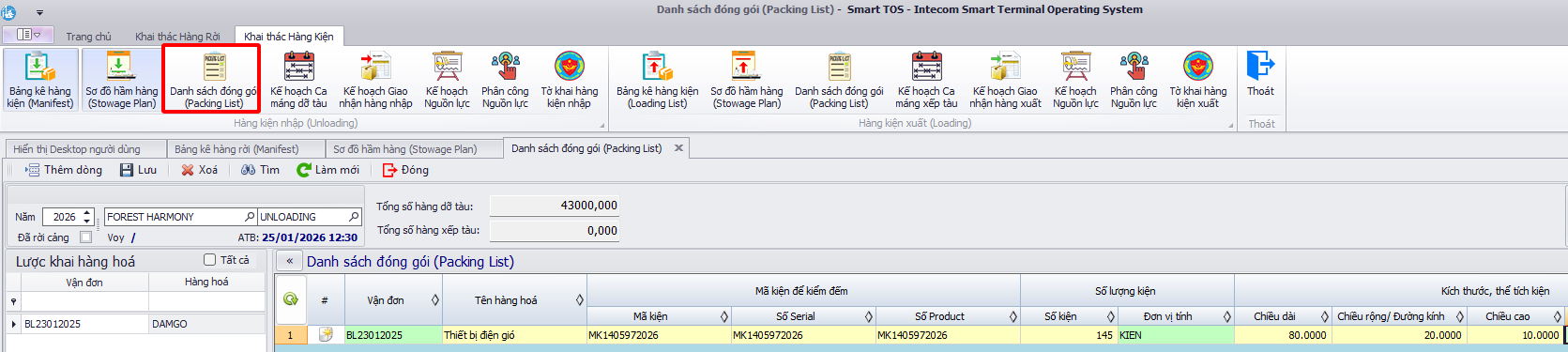 OM - Operation Managament > Khai thác hàng kiện > Danh sách đóng gói