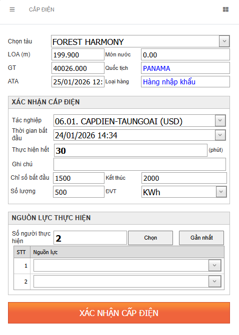 Mục đích: Trường hợp tàu/ chủ hàng có sử dụng điện của cảng để phục vụ sản xuất, điều độ hiện trường hoặc Phòng kỹ thuật thực hiện ghi nhận lượng điện mà khách hàng sử dụng để tính cước, thu tiền