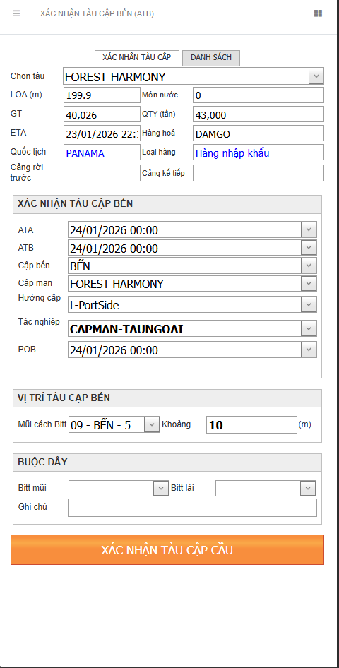 - Bước 8. Bấm nút XÁC NHẬN TÀU ĐẾN để ghi nhận tác nghiệp bắt đầu cập cầu và